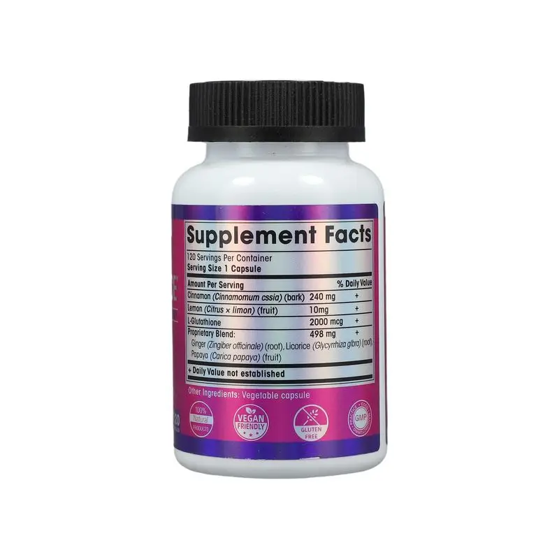 Enrichi en écorce de Cinnamomum cassia (240 mg) et en extrait de Citrus limon (10 mg) pour des bienfaits antioxydants et cutanés améliorés.